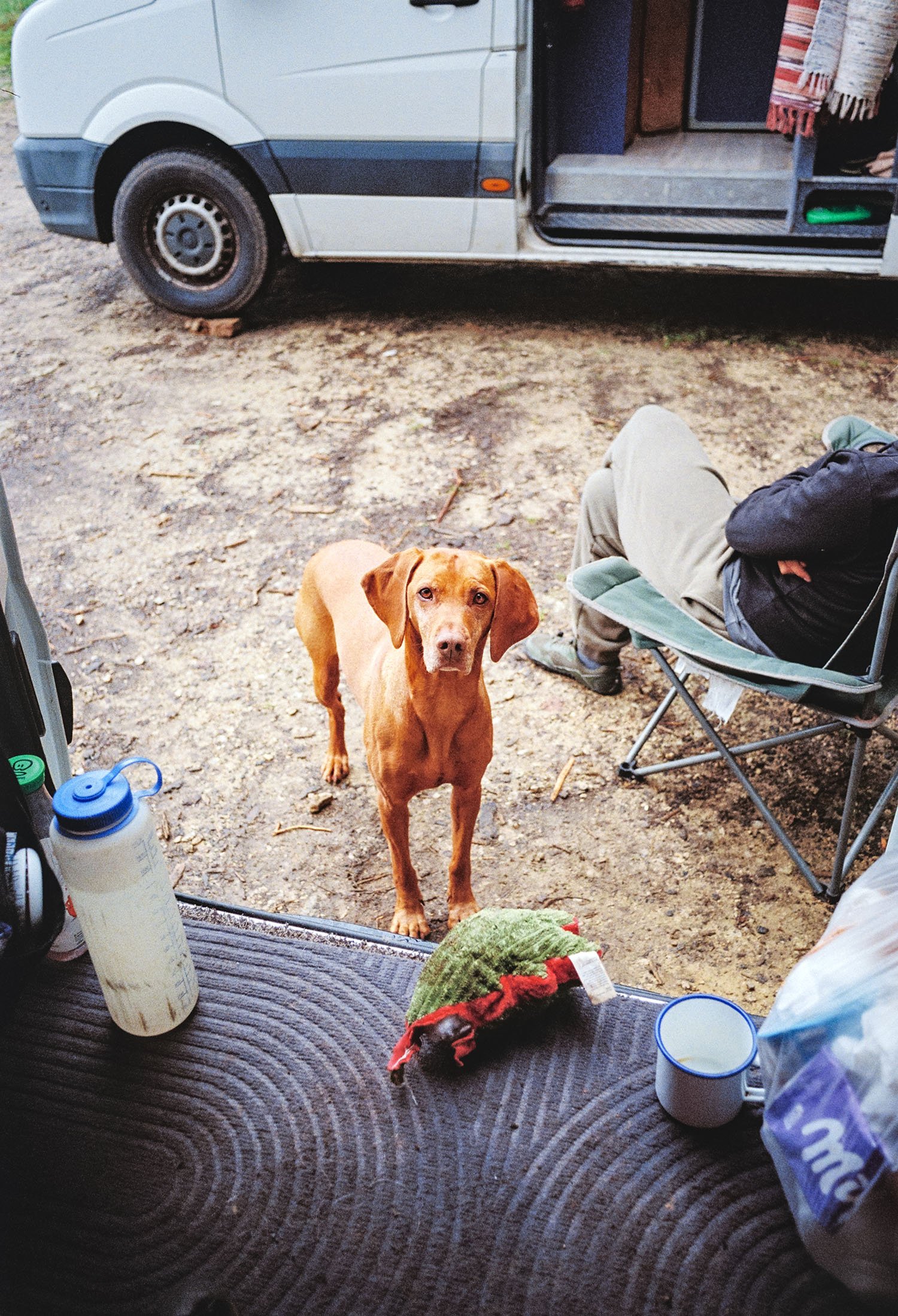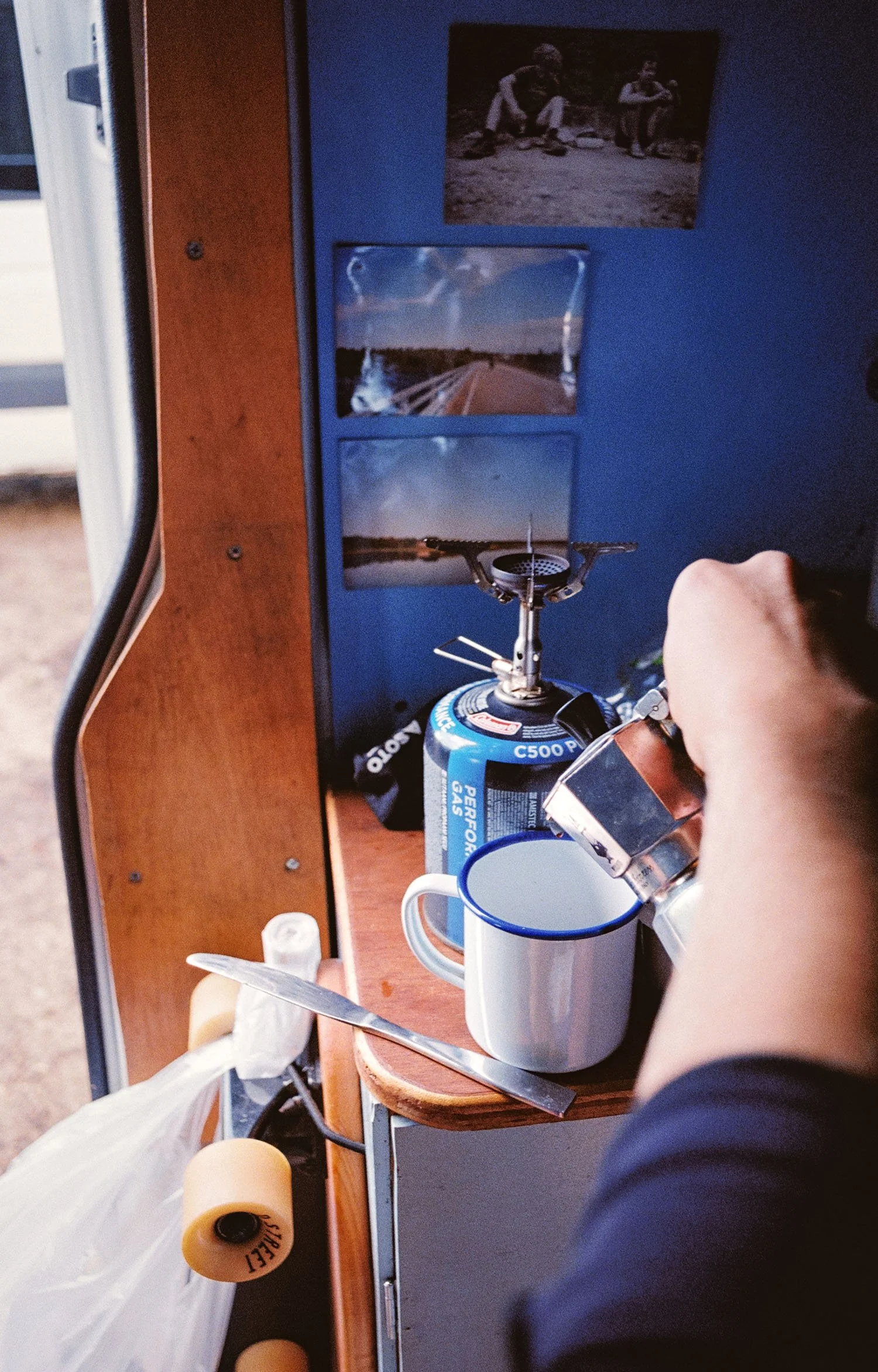 Over the few days before we left I cobbled together some shelving to sit in the back where my mountain bike usually lives. Some plywood scraps from my mum’s garage and some crates I found stopped the space turning into the jumble of bags, duvets, shoes, climbing gear and stress that it had been the other times we had both been in the van.